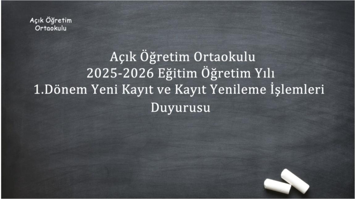 Açık Öğretim Ortaokulu 2025-2026 Eğitim Öğretim Yılı I. Dönem Yeni Kayıt ve Kayıt Yenileme İşlemleri 03 Eylül 2025 tarihinde başlayacak olup 26 Eylül 2025 tarihi mesai bitiminde sona erecektir.
